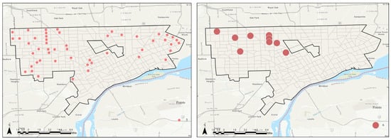 As Detroit became known as the center of the world’s automobile industry, its population began to rise in the 1910s, ranking fourth in the U.S. urban population until the 1920s and 1940s. However, as the oil crisis approached in the 1970s, the market share quickly decreased as fuel-efficient vehicles were imported from Asia. The housing market collapse in the United States in 2008 resulted in significant foreclosures and widespread property abandonment in several locations across the country [31]. This collapse affected many cities in the Rust Belt region particularly hard [32]. The real estate slump caused by the increase in vacant houses was a severe problem. About 80 million vacant houses were found in the Motor City Mapping Project survey among Detroit’s regeneration projects, half of which were ruins. Detroit’s economy and crime rates have improved significantly recently, but the problem caused by empty houses is still big.
