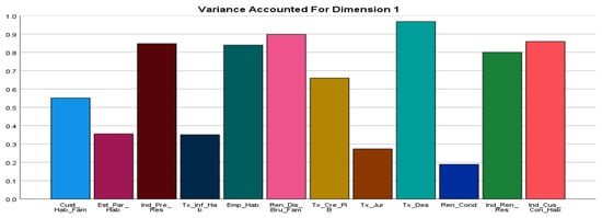 The summarized model is shown in Table 2. The analysis of the output shows that the first component (Dimension 1) has an eigenvalue of 7.594, which corresponds to 63.283% of the total variance. The second dimension (Dimension 2) has 2.236, which corresponds to 18.631%, in which both dimensions make up a total of 81.914% of the total variance.