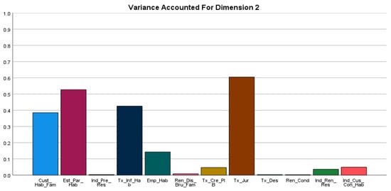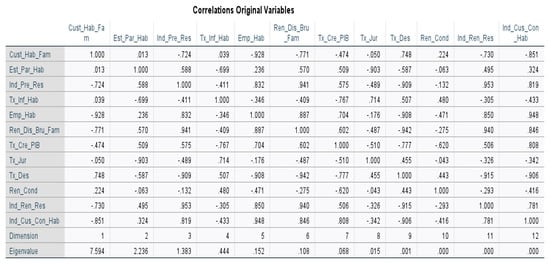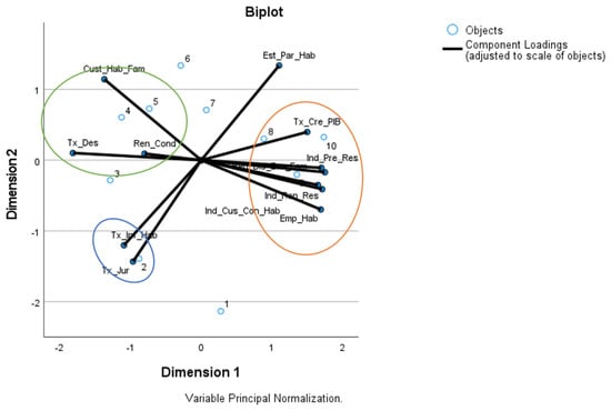 Table 6 shows the weights that the variables studied have in the two dimensions, which are later presented graphically in Figure 5. Based on the data presented, Dimension 1 includes the following as determining variables (Component Loading higher than the absolute value of 0.5) the variables Housing stock estimates (Est_Par_Hab), Residential price index (Ind_Pre_Res), Home loans to individuals (Emp_Hab), Gross disposable income of households (Ren_Dis_Bru_Fam), GDP growth rate (Tx_Cre_PIB), Residential rent index (Ind_Ren_Res) and Housing construction cost Index (Ind_Cus_Con_Hab). In Dimension 2, the variables are Housing costs per family (Cust_Hab_Fam) and Housing stock estimates (Est_Par_Hab). Interestingly, the variable Housing stock estimates (Est_Par_Hab) is defined as a determining variable in both dimensions.