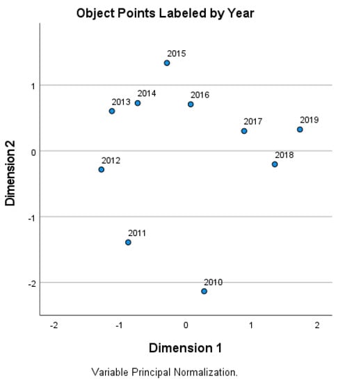 In Figure 4, we can see the behavior of the years in relation to the two dimensions in the analyzed timeline (2010–2019). In Dimension 1, there is a neutral alignment (close to zero) in the years 2010, 2015 and 2016, a negative weight in the period from 2011 to 2014 and a positive weight in the years 2017, 2018 and 2019. In Dimension 2, neutrality is obtained in the years 2012, 2017, 2018 and 2019, a negative relationship in 2010 and 2011 and a positive relationship in the period from 2013 to 2016. It is also possible to understand that there is no strong trend between the years analyzed because the dispersion of the values found in relation to the two dimensions is not concentrated.