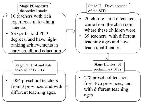The survey was conducted through four stages, and each stage had different participants (Figure 1 presented the basic information of participants at different stages). In stage I, utilizing the purposive sampling method, 10 preschool teachers from two cities in Jiangsu and Anhui provinces in China were targeted for interviews, and 6 experts in the field of early childhood education were invited to assess the theoretical model. These 10 preschool teachers had rich experiences in science teaching, and some worked kindergartens where teachers are carrying out science curriculum reform projects. The six experts are all famous professors, hold PhD degrees and have high-ranking journal publications in the field of early childhood education. The participants in stage II were mainly employed to determine the situations in which preconceptions occurred and improve the behavioral response items. In total, 20 children and 6 teachers in a city in Jiangsu province were selected on the principle of convenience and voluntary sampling for face-to-face situational interviews, while 39 teachers from three cities in Jiangsu, Anhui and Hebei provinces were randomly interviewed through both telephone and face-to-face about the response items. Stage III is a pilot test, and 278 preschool teachers from Jiangsu and Zhejiang provinces were randomly selected as participants. A total of 21 questionnaires were excluded from the sample because of some stereotyping answers. Therefore, in this stage, the final sample consisted of 257 preschool teachers (mean age = , SD = ).
