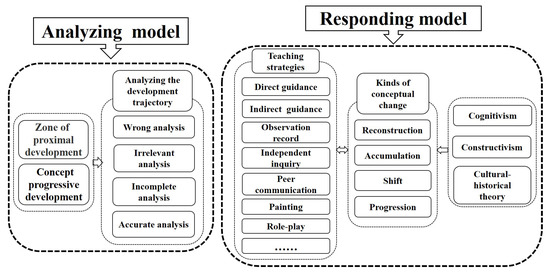 The formal responding model shows that the teaching strategies and kinds of conceptual change, which are proposed on the theory of cognitivism, constructivism and cultural-historical theory. The conceptual teaching strategies based on cognitivism and classical constructivism are used various ways, such as teachers’ direct or indirect guidance, observation and exploration, observation record and so on, to trigger cognitive conflict and obtain conceptual change [17,55]. However, conceptual teaching strategies drawing their theoretical foundations from social constructivism and cultural-historical theory [56,57] emphasize that the conceptual change in children is obtained mainly through the interaction with more knowledgeable and experienced individuals (e.g., teachers) or peers or by means of mediating cultural tools [58], such as painting, role-playing and so on [59,60].