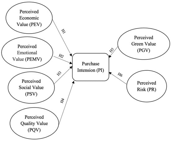 Based on the above literature review, a research model was developed. As shown in Figure 1, six constructs, namely consumer perceived economic value, perceived emotional value, perceived social value, perceived quality value, perceived green value, and perceived risk were proposed to influence U.S. consumers’ purchase intentions towards second-hand luxury products.