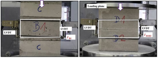 Figure 1 displays the advanced displacement measuring system, which can detect the deformation of the rock matrix or the joints directly. Also, by using external displacement sensors, it can reduce test errors caused by the interfaces between specimen and loading plates. As shown in the photos, B1 was an intact rock sample and D1D2 was jointed. As a result, the joint displacement and joint normal stiffness are calculated using Equations (3) and (4):