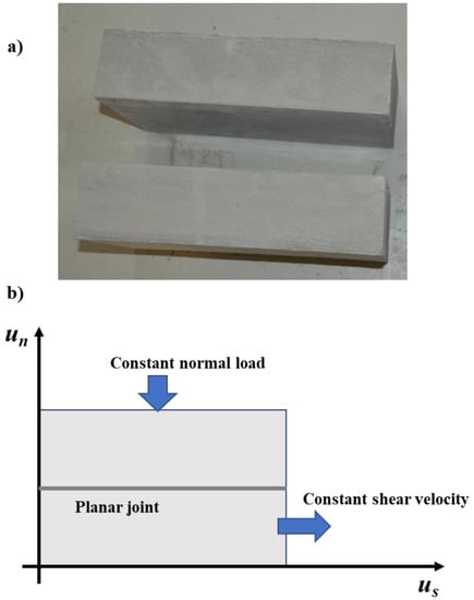 For direct shear tests of planar joints, a GS-1000 shear box device [27] was used (Figure 2). Four shear rates (100 mm/min, 10 mm/min, 1 mm/min, and 0.1 mm/min) and three levels of normal stress (1.25 MPa, 1.875 MPa, and 3.75 MPa) were selected for our tests. Shear displacements were measured with a highaccuracy (±1 micron) horizontal LVDT affixed to the lower part of the shear box. Force sensors were built into vertical and horizontal loading pistons, which measured the corresponding load values. Nguyen et al. [7] have published the specimen installation procedures, and we followed these principles. The relative parameters used for the different modes of testing are reported in Table 2.