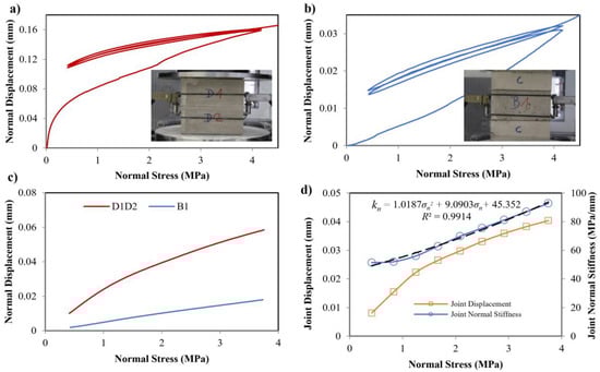Joint closure test results are shown in Figure 3. During the first loading stage, there was some porosity of the specimen and a certain amount of space of the contact surface. Only the repeated (second round) loading/unloading parts were selected for calculation (shown in Figure 3a,b). The measured normal displacements were normalized so that a normal stress of 0 MPa corresponded to a normal displacement of 0 mm (Figure 3c). Figure 3d shows that joint normal displacement (calculated by Equation (3)) and joint normal stiffness (calculated by Equation (4)) changed with change in normal stress, and both of them increased with an increase in normal stress. The normal stiffness ranged from 51 to 92 MPa/mm within normal stress from 0.4 to 3.75 MPa. The normal stiffness changing trend agrees well with the previous research [6,8]. The normal stiffness can be calculated by using the following formula: