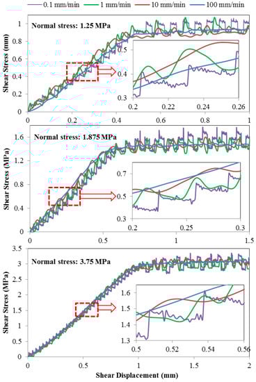 In order to eliminate any errors caused by the space between the specimen and shear box device (shearing stage: A–B) the lab test result was modified, as shown in Figure 4. The elastic stage of the shear stress was extended to zero, then the starting point of the shear displacement was shifted to zero. The modified shear stress–displacement curves are shown in Figure 5. It can be seen that shear stresses increased with increasing normal stresses. Shear velocity had little influence on the peak shear stress, which differed from the results reported by Atapour and Moosavi [17]. In general, increasing shear velocity could increase or decrease the shear strength according to the material characteristics. For our material and the tested velocity range (0.1 mm/min~100 mm/min), the shear velocity had only very little influence on shear strength (negligible). The properties of Atapour and Moosavi’s [17] material (e.g., compressive strength, Young’s modulus, Poisson’s ratio, microstructure, grain size distribution, etc.) are different to ours. Therefore, we believe that depending on the material increasing or decreasing or even staying more or less constant, shear strength can be observed with varying shear velocity. However, shear veloctiy has significant influence on the stick–slip behavior (from the partial enlarged drawing in Figure 5, the stick–slip characters were observed in all the direct shear tests). The shear stress–displacement curves fluctuate significantly at low shear velocities, which means that lower shear velocity leads to more pronounced stick–slip behavior. It can be concluded that stick–slip behavior increases with decreasing shear velocity. This conclusion agrees with the results reported by Bro [28].
