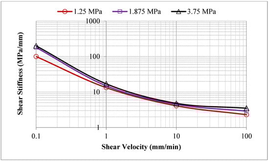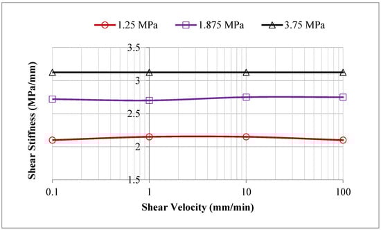 Average shear stiffness was calculated for all tests based on the slope of the increasing branch of the graphs in Figure 5. As shown in Figure 6, average shear stiffness increased with increasing normal stress. Under the same normal stress level, average shear stiffness was nearly contant at different shear velocities. Here, the calculated shear stiffnesses were about 2.2 MPa/mm, 2.7 MPa/mm, and 3.2 MPa/mm under normal stress of 1.25 MPa, 1.875 MPa, and 3.75 MPa, respectively. Under these normal stress levels, the corresponding normal stiffnesses were 56 MPa/mm, 69 MPa/mm, and 90 MPa/mm, respectively. The ratio between the normal stiffness and average shear stiffness was about 26:28 in all tested normal stress levels. This ratio is a good reference for selecting the numerical simulation parameter. Instantaneous maximum shear stiffness was calculated for all tests based on the slope of the instantaneous increasing part of the partially enlarged drawing in Figure 5. As shown in Figure 7, instantaneous maximum shear stiffness also increased with increasing normal stress, but was significantly influenced by shear velocities. With increasing shear velocity, instantaneous maximum shear stiffness dropped dramatically. It is worthwhile to note that the instantaneous maximum shear stiffness was mainly decreased by shear velocity in the range of 0.1–1 mm/min. At higher shear velocities (10–100 mm/min), the stiffness was less affected by the shear velocity, and it was close to the average shear stiffness. The variation behavior of the instantaneous maximum shear stiffness was associated with the stick–slip behehavior. Comprehensive understanding of the mechanism of the stick–slip behavior leads us to a deeper understanding of instantaneous maximum shear stiffness changing along with shear velocity.