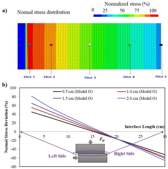 (a) Contours of normal stress for shear test with the applied normal stress of 1.875 MPa when shear displacement reached 20 mm, and (b) simulated results, uneven normal stress arrangement (deviation from average value) along the shear direction.