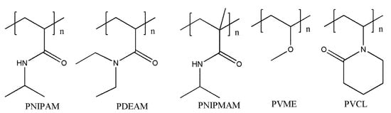 The common polymer segments used to construct temperature-responsive macromolecular self-assembly are shown in Figure 2, such as poly (N-isopropyl acrylamide) (PNIPAM), poly (N, N-diethyl acrylamide) (PDEAM), poly (N-isopropyl meth acrylamide) (PNIPMAM), polymethyl ethylene ether (PVME), polyvinyl caprolactam (PVCL), etc.