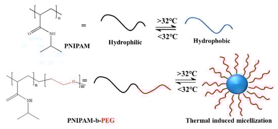 Talsma et al. introduced PNIPAM into polyethylene glycol (PEG) to prepare PNIPAM-b-PEG. They found that when the temperature is 25 °C, which is lower than the LCST of PNIPAM blocks, both blocks are fully hydrophilic and can be dissolved in water [87]. However, when the temperature increases to 45 °C, which is higher than the LCST of PNIPAM blocks, PNIPAM blocks become hydrophobic. The block copolymer turns from fully hydrophilic to amphiphilic in aqueous solution; therefore, a micellar structure with PNIPAM as the core and PEG as the shell can be self-assembled, as shown in Figure 3.