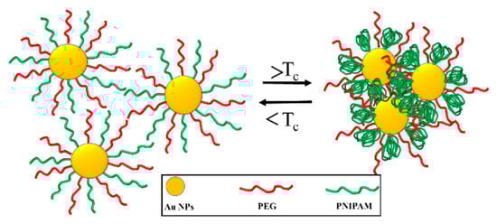 Chen et al. studied the temperature-responsive self-assembly of amphoteric gold nanoparticles (AuNPs) molecules (Au@PEG/PNIPAM) modified by PEG and PNIPAM. As shown in Figure 4, when T < Tc (e.g., at 25 °C), both PEG and PNIPAM are hydrophilic, and Au@PEG/PNIPAM is independently dispersed in aqueous solution. When T > Tc (e.g., at 50 °C), the PNIPAM chain becomes hydrophobic and aggregates at the junction of AuNPs to form a local hydrophobic region [89]. The PNIPAM chain and PEG chain self-assemble into oligomers by phase separation.