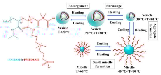 Yoshida et al. studied the temperature-responsive self-assembly of a zwitterionic block copolymer (PNIPAM-b-PMPDSAH) composed of PNIPAM and N, N-dimethyl-N-(3-(methyl acrylamide group) propyl group) amino propane sulfonate [90]. When the temperature was lower than 35 °C, PNIPAM-b-PMPDSAH formed vesicles in aqueous solution. When the temperature of the solution increased (20–40 °C), the vesicles grew from small to large and then from large to small, and gradually disappeared. When the temperature of the solution increased to about 55 °C, macroaggregates (large micelles with PNIPAM as nucleus and PMPDSAH as shell) were formed. As the solution temperature continued to rise, the turbidity of the solution became clear, and a small spherical micelle with PNIPAM as the nucleus and PMPDSAH as the shell was formed, as shown in Figure 5. PNIPAM-b-PMPDSAH has triple thermal response characteristics. The first transition is the UCST-type transition at 20–37 °C. The increase in temperature leads to the destruction of the force between the ions in the copolymer chain. The disintegration of the ionic network leads to the destruction of the vesicle structure. The second transition is the LCST type transition at 37–47 °C. The PNIPAM segment changes from soluble to insoluble, and the polymer recombines into larger aggregates. As the temperature continues to increase, the repulsion between the PMPDSAH chains and PNIPAM spherical aggregates increases; thus, the aggregates depolymerize to form small spherical micelles with a core–shell structure.