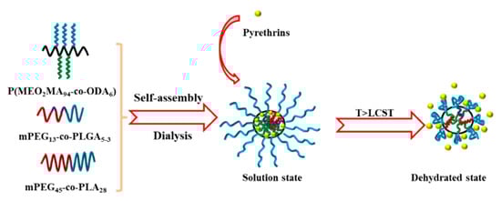 Ma et al. prepared a kind of temperature-responsive cooperative self-assembly system based on poly(2-(2-methoxyethoxy) ethyl methacrylate-co-octadecyl methacrylate) (P(MEO2MA94-co-ODA6)), monomethoxy polyethylene glycol-b-poly (D, L-lactide-co-ethyl lactide) block polymer (mPEG13-b-PLGA5-3) and monomethoxy polyethylene glycol-b-(D, L-lactide) (mPEG45-b-PLA28) [92]. As shown in Figure 6, spherical micelles with poly (2-(2-methoxyethoxy) methacrylate, poly (D, L-lactide-co-ethyl lactide) and poly (D, L-lactide) chain segments as shells and poly (ethylene glycol) and poly (octadecyl methacrylate chain segments as the core can be formed by self-assembly of the system in aqueous solution. When the temperature is higher than 18 °C, the micelles undergo phase transformation to release the encapsulated pyrethrin, which can realize the intelligent release of insecticides. Research shows that P(MeO2MA94-co-ODA6) is temperature-sensitive and has an LCST (≈17.9 °C). When the temperature is higher than LCST, the polyocracy methacrylate chain segment changes from hydrophilic to hydrophobic, and the previous hydration is destroyed, resulting in the destruction of the mixed-mice structure and the release of the contained pyrethroid.
