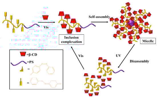 Zhang et al. studied the synthesis of block copolymer PS-b-PAzo containing polystyrene (PS) and azobenzene (Azo) segments [102]. As shown in Figure 7, under visible light (Vis) irradiation, azobenzene exhibited a trans structure, and became hydrophilic by inclusion with β-cyclodextrin (β-CD), which is assembled into micelles with PS as the core and β-CD as the shell. However, under UV irradiation, azobenzene changed from a trans to cis structure, resulting in the separation of Azo from β-CD cavity, and the chain segment changed from hydrophilic to hydrophobic, so that the micelle reassembled into the original polymer chain.