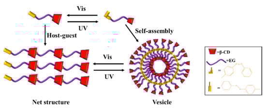 Xu et al. reported the light-responsive macromolecular self-assembly of a supramolecular polymer (Azo-EG-β-CD) synthesized from a β-CD derivative containing an azobenzene terminal group and oligomer ethylene glycol [103]. As shown in Figure 8, Trans-Azo-EG-β-CD forms intermolecular host–guest complexes in the aqueous solution and self-assembles to form a network structure. The conversion of trans azobenzene to cis azobenzene can be induced by ultraviolet light, while the reverse can be induced by visible light. When the Azo-EG-β-CD solution is irradiated with ultraviolet light, the host–guest complex is converted into a single cis-Azo-EG-β-CD molecule; then, the cis-Azo-EG-β-CD molecule self-assembles in water to form a vesicle structure. When irradiated with visible light, it can undergo reverse transformation to form an intermolecular host–guest complex.