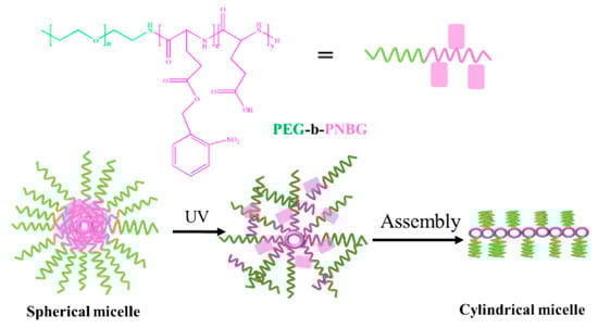 Li et al. prepared light-responsive self-assembly of PEG-b-poly (o-nitro benzyl-L-type glutamic acid) (PEG-b-PNBG) diblock copolymers with ring-opening polymerization [105]. As shown in Figure 9, after adding deionized water dropwise into THF solvent and removing THF using the dialysis method, PEG-b-PNBG self-assembled into spherical micelles with hydrophobic PNBG as the core and hydrophilic PEG as the shell. After two hours of UV irradiation, it was found that the solution changed from transparent to light yellow and the spherical micelles changed to cylindrical micelles. This is due to the decomposition of o-nitrobenzyl groups under UV irradiation and conversion to o-nitrobenzaldehyde and hydrophilic polyglycolic acid (PGA); the amphiphilicity of block copolymers is destroyed, resulting in the change of the solution’s color and micelle’s morphology.