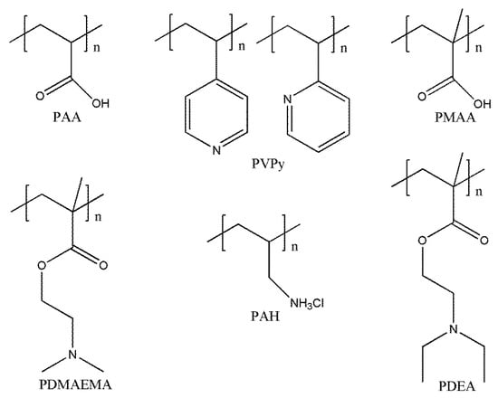 pH is a very widely used external stimulus. Therefore, pH-responsive macromolecular self-assembly is the most widely studied form of intelligent responsive self-assembly at present. In general, such self-assembled macromolecules usually contain pH-sensitive groups (such as amine, carboxyl, and pyridine groups). As the pH value of the system approaches a certain value, the pH-sensitive segments undergo a reversible conformational transition (sometimes accompanied by a phase transition) [106,107], which causes hydrogen bonding or electrostatic complexation between different blocks or different polymers and changes their solubility. Such macromolecules are generally classified into two types: (1) macromolecules with uncharged basic units (such as amines) that are hydrophilic at low pH and protonate into hydrophobic chain segments at a high pH; (2) macromolecules of charged acidic units (such as carboxyl groups) that are protonated at a low pH and electronegative at a high pH. Common macromolecules with pH responsiveness are as follows: polyacrylic acid (PAA), polyvinyl pyridine (PVPy), polymethacrylic acid (PMAA), polymethylacrylate-N, N-dimethyl aminoethyl ester (PDMAEMA), polyallylamine hydrochloride (PAH), polymethacrylate-2-(diethylamino) ethyl ester (PDEA), etc., as shown in Figure 10.
