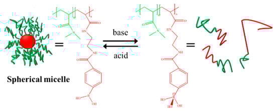 Sumerlin et al. synthesized a PDMA-b-PAPBA block copolymer containing phenylboric acid (PBA) and N, N-dimethylacrylamide (DMA) by using the reversible addition–fragmentation chain transfer polymerization (RAFT) technique and made use of the characteristic that phenylboric acid groups can form a hydrophilic tetrahedral structure with a negative charge under alkaline conditions. The reversible conversion of micelles and polymer chains was realized by changing the pH value, as shown in Figure 11 [109].
