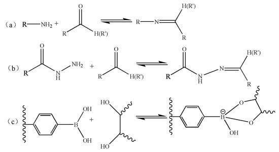 With the development of self-assembly, pH-responsive macromolecule self-assembly is no longer limited to the macromolecule systems containing protonated or deprotonated groups. Some dynamic covalent bonds [113] that can reversibly “form” and “break” with the change of pH have gradually been introduced into the macromolecule self-assembly system. A dynamic covalent bond is a special kind of covalent bond, which has the stability of a covalent bond and the characteristics of reversible “formation” and “fracture” of a non-covalent bond, meaning that the system has strong stability and stimulus responsiveness. Common pH-responsive dynamic covalent bonds are as follows (Figure 13): (a) imine bonds formed by the reaction of primary amines with a carbonyl or aldehyde group [114]; (b) arylhydrazone bonds formed by the reaction of acyl hydrazide group with aldehyde group or ketone [115]; (c) the reaction of a phenyl borate group with a dihydroxyl group to form a phenylboronate bond [116,117].