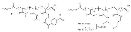 Fulton et al. synthesized block polymers P1 and P2 containing benzaldehyde and amine groups, respectively (Figure 14) [118]. When the pH of the system is 11, the aldehyde and amine groups will form imine bonds, and the system will form micelles with imine bond chain segments as cores and other chain segments as shells. When the pH of the system decreases to 5.5, the imine bonds break and the micelles dissociate.