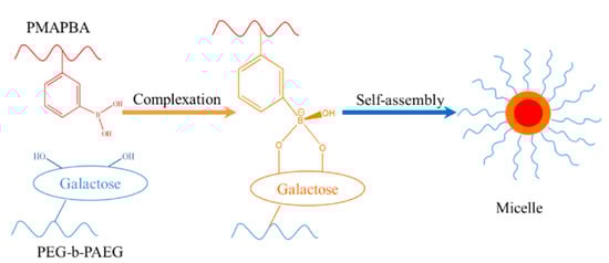Zhang et al. synthesized a homopolymer containing phenyl boric acid (PMAPBA) and a block copolymer containing galactose (PEG-b-PAEG) by performing RAFT polymerization and ATRP polymerization, respectively [119]. In an alkaline solution, the phenylboronate group in PMAPBA will form a micelle with PMAPBA and phenyl borate as the core, and PEG chain segments as the shell. When the pH of the solution becomes acidic, the phenyl borate bond breaks and, as a result, the micelles formed dissociate again, as shown in Figure 15.