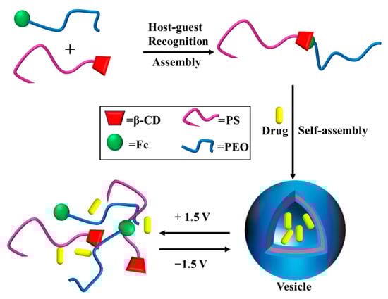 Yan et al. modified β-CD on one end of hydrophobic PS and Fc on one end of hydrophilic poly (ethylene oxide) (PEO) [121]. Based on the host–guest recognition between β-CD and Fc groups, PS-β-CD and PEO-Fc were connected together. A novel amphiphilic block polymer with a controllable structure was prepared. As shown in Figure 16, vesicles can self-assemble in aqueous solution. When applied at 1.5 V, Fc was oxidized to Fc+, and PEO-Fc+ separated from the CD cavity of PS-β-CD, resulting in the dissociation of the vesicles. When the dissociated system was subjected to a voltage of −1.5 V, Fc+ reduced to Fc, which was repackaged with PS-β-CD to form vesicles again. The system can be used for controlled drug release system after drug loading, and controlled drug release can be achieved by regulating vesicle dissociation.