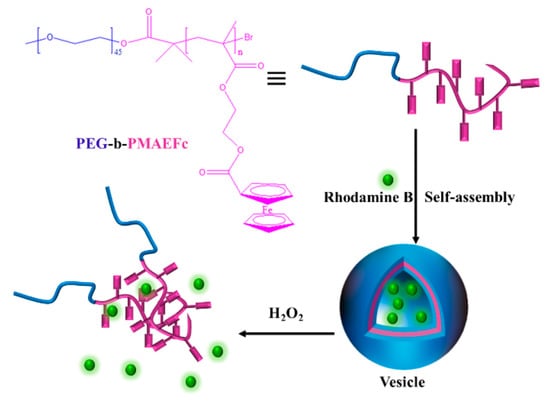 Zhang et al. prepared amphiphilic block copolymer polyethylene glycol-b-poly-2-(methylacrylyl oxy) ferrocene carboxylate (PEG-b-PMAEFc) using the ATRP method [123]. As shown in Figure 17, the block copolymer spontaneously assembles in aqueous solution to form vesicles with a redox response. After adding H2O2, Fc was oxidized to Fc+, the ferrocene group changed from hydrophobic to hydrophilic, the vesicle structure was destroyed, and large aggregates were formed. However, the destroyed vesicles could not be reduced after the addition of antioxidant acid, because the oxidized ferrocene was confined to the dense, unoxidized ferrocene structural domain, which impeded the reduction. However, the destroyed vesicles could not be reduced after the addition of antioxidant acid, because the oxidized ferrocene was confined to the dense, unoxidized ferrocene structural domain, which impeded the reduction. Since the structure of the vesicle formed by this self-assembled system is affected by oxidants, it can be used as a drug carrier, which can destroy the vesicle structure to release drugs (e.g., Rhodamine B) in an oxidizing environment.