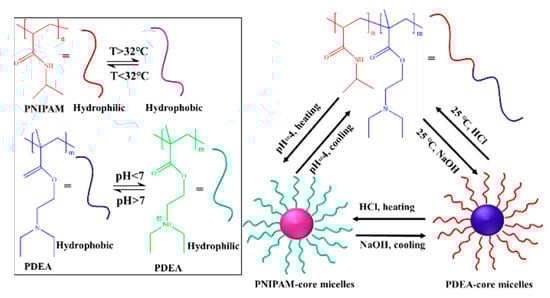 Self-assembly gradually develops from a single stimulus response to multiple stimulus responsiveness. In some special applications, people often require a multiple-responsive ability of self-assembly. It is of great importance to develop multiple-responsive self-assembly. Appropriate stimulation methods can be selected according to the different environments so as to meet actual needs. For example, combined with external changes such as temperature, pH or ionic strength, fully hydrophilic macromolecules can also exhibit interesting micellization behavior in aqueous solutions. Among them, there are more studies on systems with a dual responsiveness of temperature and pH [125,126].