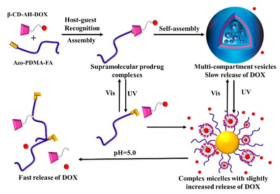 Bai Yang et al. study light/pH supramolecular prodrug complexes (SPCs) based on β-cyclodextrin (β-CD)-aclhydrazone-doxorubicin (DOX) (β-CD-AH-DOX) and the targeting of azobenzene-terminated poly (2-(dimethylamino) ethyl methacrylate) (Azo-PDMA-FA) (β-CD-AH-DOX), as shown in Figure 19 [128]. After adding water dropwise into the DMF solution of SPCS and removing DMF by performing dialysis, SPCS self-assembled and formed multi-compartment vesicles, with a slow-release rate of DOX. This is due to the amphipathicity of SPCs, and the formation of multicompartment vesicles is caused by the aggregation of small vesicles with weak hydrophobicity. When the solution is irradiated with UV, azobenzene changes from a trans configuration to a cis configuration, resulting in the host–guest interaction with β-CD being destroyed. Then, the inclusion complex is dissociated, and multi-compartment vesicles transfer composite micelles. Therefore, the DOX release speed is accelerated. When the solution was irradiated with visible light, azobenzene changed from a cis configuration to trans configuration, and formed an inclusion complex with β-CD-AH-Dox again due to host and guest interaction. The composite micelles were able to change back to multi-compartment vesicles again, and the release rate of DOX slowed down again. When the pH of the adjusting solution was gradually reduced from 7.4 to 5, the acylhydrazone bond was partially broken, and a large amount of hydrophobic DOX was released. The research is expected to lead to the development of cancer treatments.