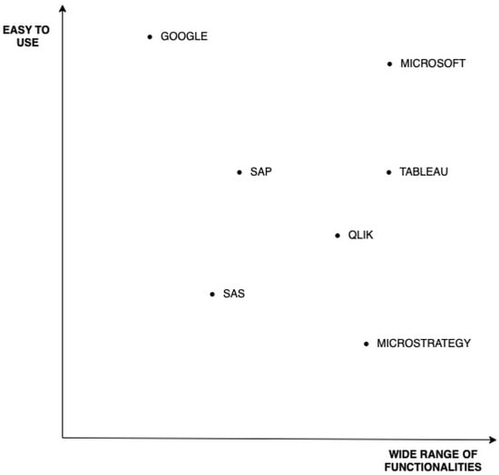Technologies and Power BI platforms offered by Microsoft, as well as Tableau (Tableau Desktop version 2021.1.1 by Tableau Software Inc., Seattle, WA, USA) and Qlik (Qlik Sense version 2.1 by Qlik Technologies Inc., King of Prussia, PA, USA) software, are currently listed as market leaders. All of the mentioned companies offer comprehensive platforms for data visualization analysis. Additionally, the Power BI platform combines several tools in one service. In the case of many other solutions, several components must be installed and used separately, which can be an essential factor in determining a company’s choice of a specific BI technology [33,34].