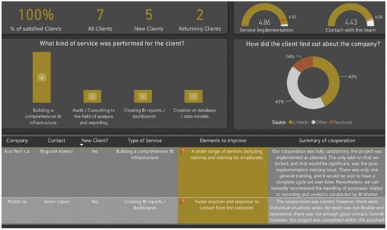 All the factors mentioned above allow accurate and prompt decisions to be made based on customer feedback. Based on the received information, a company can plan its further development, which will not entail additional costs related to an analysis of feedback because the presented tool allows service input from large numbers of customers. BI tools allow us to use not only the data but also the potential of the institution’s employees because they have much more time to act based on data, which are additionally provided in a friendly, understandable, and error-free manner.