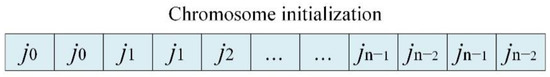 There are many encoding methods of chromosomes in the genetic algorithm, and an appropriate encoding method can improve the efficiency of the global optimal solution and its of finding ability. Due to the complexity and particularity of discrete production scheduling, a procedure-based coding method is chosen in this work, and the encoding mode of chromosomes is shown in Figure 1. The length of chromosomes is related to the number of machines and workpieces. Therefore, if there are m machines, n workpieces, and i process (0 ≤ i < n) of each machine, the length of the chromosome is chSize ≤ (n × m). Since the number of processes may not be equal for different workpieces, the length of the chromosome should be the sum of the number of processes in all workpieces. In a specific chromosome, the coding rule is that the number of times a workpiece appears in a chromosome indicates the number of processes it needs to be processed, such as, for example, the first occurrence of j1 in chromosome means the first process of j1 workpiece, and the fourth occurrence means the fourth process of j1, based on which the process of the other workpiece can be deduced.