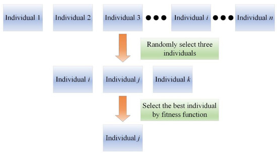 When selecting individuals in a population, excellent individuals are selected with a high probability, while those with low fitness are selected with a low probability. Therefore, the population will evolve in a good direction at the beginning of the iteration. A tournament method is used to select individuals, which removes the best one to enter the offspring population and repeats the operation until the new population size reaches the original population size. The main operation method is used to randomly select Z individuals from the population, let them compete for fitness, and then select the best one from them. In this work, all individuals participating in the championship are the whole population, and Y is the number of randomly selected individuals from the population and Y = 3; then, the optimal individual j is selected. The steps are shown in Figure 2.
