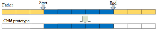 Step 2: One chromosome is selected as the father, a gene fragment is intercepted by randomly determining two positions in the chromosome, and the intercepted gene fragment is used as a progeny chromosome prototype. The operation process is shown in Figure 3.