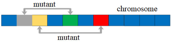 Mutation operation has a relatively small probability in the genetic algorithm; however, it also has a significant impact on the more diverse population. Therefore, the mutation probability should be adjusted slightly in the same way as the crossover operation; the mutation probability has a great relationship with the fitness value of chromosomes and the number of iterations of the population. The mutation operation is mainly based on the location mutation method, which randomly selects chromosomes in the population according to the probability, randomly determines the two locations of chromosomes, and carries out gene exchange to generate new chromosomes in this way. In this algorithm, two pairs of the chromosomes’ genes are exchanged, as shown in Figure 5.
