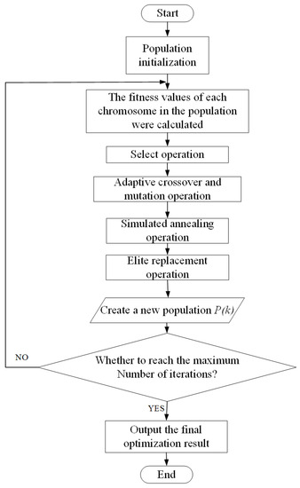 In order to improve the local searching ability of the genetic algorithm, a new hybrid genetic algorithm is proposed. A simulated annealing algorithm is created, which is different from the previous genetic simulated annealing algorithm in that the simulated annealing operator is adjusted [27]. In the past hybrid genetic algorithms, the simulated annealing operator lacks the memory function. However, using the memory function saves the optimal solution generated in the annealing process in this work. Moreover, in the simulated annealing factor, the optimal solution is introduced by probability and is mutated to obtain the optimal individual as far as possible, and the heating strategy is added to avoid falling into the local optimum. The fitness function of the new individual is compared with that of the original individual, and whether the original individual replaces the original individual through the result is determined to ensure that the individual is as good as possible.