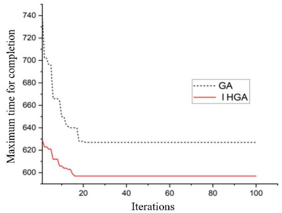 For example, it can be seen from the comparison of results in Table 3 that both IHGA and GA algorithms can find the optimal solution; however, the average value obtained by IHGA is better than that obtained by GA, which means that IHGA has good robustness. After a period of comparative testing, the convergence of the iterative curves of the two algorithms, in dealing with the LA03 scheduling problem, is shown in Figure 7. As can be seen from Figure 7, GA not only has a slow convergence speed when searching for the optimal value, but also cannot find the optimal value, and converging occurs at about 630. The IHGA has a relatively fast convergence speed and can jump out of the local optimum in time and find the global optimum value of 597. This indicates that the IHGA proposed in this work is obviously superior to the genetic algorithm and can solve the production scheduling problem of the workshop more effectively.