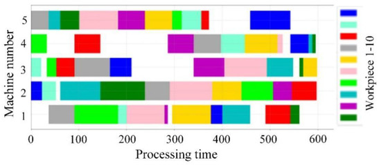 Taking LA03 as an example, the IHGA can determine the currently known optimal fitness solution 597, select the chromosome with the best fitness, and obtain the corresponding scheduling Gantt chart according to the process arrangement results of each part in the chromosome, as shown in Figure 8. The Gantt chart can prove that the IHGA proposed in this work can provide an excellent and effective solution for production scheduling in discrete industries.