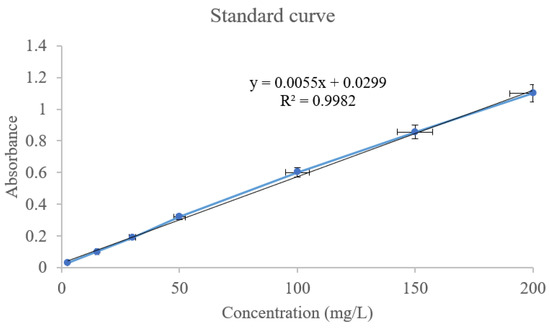 The extracts of fruit peels were prepared in different solvents, i.e., ethanol, methanol, and acetone. The concentration of plant phenolics varies according to the nature of the solvent and the method used for extraction. The Folin–Ciocalteu (F-C) reagent is generally used for the determination of phenolic contents in the extracts. This F-C can also react with other non-phenolic components, i.e., folic acid, ascorbic acid, thiamine, nucleic acids, ascorbic acid, and some metal ions [27]. Since the most abundant antioxidants present in the extracts are phenolics, the values obtained by the F-C reagent are due to the phenolic contents. Gallic acid was used as standard, and a calibration curve was prepared using different concentrations (15, 30, 50, 100, 200 mg/L) of gallic acid. The linear relationship between the concentrations of gallic acid and absorbance is shown as a standard curve in Figure 1.