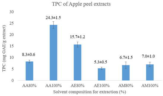 The concentration of total phenolic contents (TPC) of apple, orange, and banana peel extracts was expressed in mg of gallic acid equivalent per gram of the extract (mg GAE/g). The concentration of phenolic compounds in apple peels ranges from 5.3 ± 0.5 to 24.3 ± 1.5 mg GAE/g, as shown in Figure 2. Quantitative analysis of phenolic contents from different apple varieties has confirmed the highest level of phenolics, i.e., catechins, flavonol glycosides, and rutin, are in apple peels compared to pulp [28]. Phenolic compounds are mainly responsible for the antioxidant activity of apple peels. The results showed maximum TPC in pure acetone while the minimum was found in pure ethanol. The acetone can better penetrate the plant cells and extract the phenolics efficiently [29]. The values of TPC were comparable to the values reported [16].