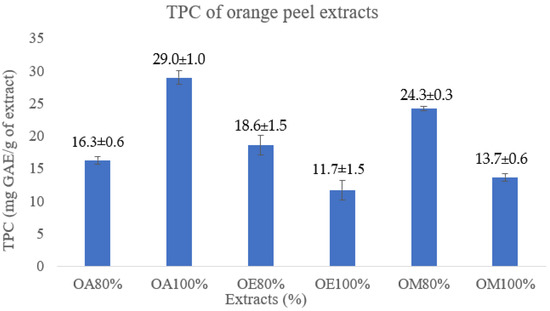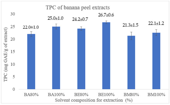 Banana peels make a significant contribution to agro-industrial waste, which can not be utilized efficiently. The best way to consume these is to extract their phenolic contents for use in the food or cosmetic industries. In banana peel extract, TPC ranged from 21.3 ± 1.5 to 26.7 ± 0.6 mg GAE/g, as shown in Figure 3. Maximum phenolics were found in pure ethanol followed by pure acetone, while minimum phenolics were in 80% methanol. The literature has confirmed maximum phenolic contents in the banana peels as compared to the pulp and gallocatechin was most abundant among other polyphenols [30]. The concentration of phenolics in banana peels has been reported in the literature [7]. Orange peels showed TPC values from 11.7 ± 1.5 to 29.0 ± 1.0 mg GAE/g, as shown in Figure 4. A high level of TPC was found in acetone (100%), followed by 80% methanol, while minimum phenolics were depicted in pure ethanol and pure methanol.