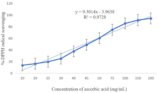 Antioxidant activity is related to the concentration of phenolics in fruit peel extracts [32]. It was measured in terms of DPPH radical scavenging activity. All the extracts showed different radical scavenging patterns, as shown in Figure 5. Antioxidant activity of peel extracts ranged from 60.2% to 75.6% free radical scavenging, with apple peel extracts exhibiting the best antioxidant activity in terms of DPPH radical scavenging. It has been investigated that apple peels showed higher antioxidant potential than apple flesh [33]. These peel extracts also exhibited antimicrobial and anticancer activities. The phenolic extracts of peels can represent a valuable source of antioxidants for reducing photooxidation. The antioxidant activity of standard ascorbic acid as a function of increasing concentration is shown in Figure 6. One of the important extrinsic factors that induce skin aging is the oxidative stress caused by UV radiation [34]. In prolonged exposure to sunlight, free radicals are produced in the skin. These reactive oxygen species (ROS) not only cause the oxidation of biomolecules but also damage the dermal connective tissues, ultimately affecting the skin elasticity that leads to aging effects [35]. Antioxidants scavenge free radicals and hence minimize oxidative stress [36]. The free radical scavenging mechanism can be utilized to formulate the antiaging formulation by incorporating the natural extracts of phenolic compounds. Hence the free radical scavenging activities of fruit peel extracts make them a potent ingredient for skincare cosmetic formulations.