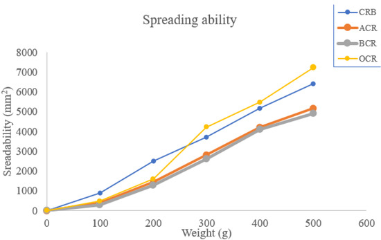 The term spreadability of the emulsion is used to express the extent of ease by which an emulsion is applied to the skin. It is an important characteristic as it determines the even distribution of the active ingredients in the emulsion. Different factors can affect the spreadability of the emulsion, i.e., the temperature, composition of the emulsion, storage conditions, and viscosity of the emulsion. In order to see the difference, the spreadability of the emulsion prepared with extracts and that of the control base were compared. Under the similar condition of temperature, there was no change in the spreadability of different emulsion samples except one, which contained orange peel extracts. A good spreadability value defines the distribution and enhances the absorption of active ingredients in the skin. The values of the spreadability of the formulations samples (ACR, BCR, OCR) are presented in Figure 7. There was a linear increase in the spreadability of the sample with the increase in applied weight. All the samples showed good spreadability values. In the case of cream formulated with orange peel extract, the spreadability increased significantly as compared to other cream samples. Orange peel extracts contain anthocyanins, in addition to other flavonoids [39]. Due to their increased interaction of anthocyanins with the water phase of the O/W type emulsion, this cream sample has low viscosity and, thus, higher spreadability than other samples.