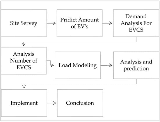 To estimate charging station demand, we must first identify and monitor the many influencing elements in electric car charging stations. If the owner is willing for charging, then the correction factor will be considered as 1 or else it is considered as zero. The link of both the computational elements and the mathematical model, based on the forecast of vehicular usage, must, therefore, be developed [,,]. Finally, we discovered a suitable size for an electric car charging station. Perhaps the charging network’s demand forecasting methodology is as follows: