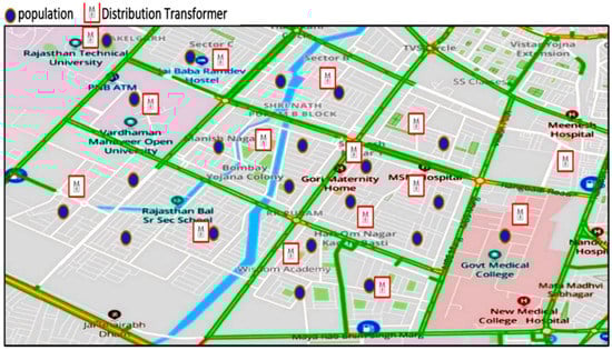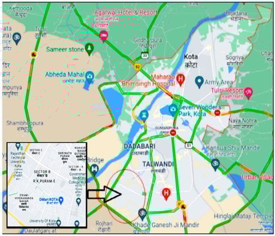 As Kota is a city with a population of 1,474,243 people and 509,535 vehicles, which is fast moving toward electric vehicles to minimize pollution and improve the city’s air quality index, we decided to analyze and install our charging stations in a recently created section of the city, called Rama Krishna Puram [,]. Our goal is to provide charging stations so that everyone who needs to charge their electric vehicle may do so. With a population of 11,881 people (rate of increase in population every year is 3.03%) and a 2.23 km2 area, Ramakrishna Puram has the following density [,]: