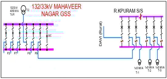 where signifies EV charging simultaneity or the ratio of charging EVs to total EV quantity in statistical likelihood. stands for the average charging power [,]. The power supply for R.K Puram region of Kota city is shown in Figure 3, according to which this region is being supplied 3 × 5 MVA power rating (i.e., total of 15 MVA) which is sufficient to fulfill EV users’ charging demand. We can extend the range of power as per requirement as this region has its own bus bar and distribution system which is powered by 132/33 kv Mahaveer Nagar GSS substation (40,150 MVA). Distribution network power losses are the normal I2 R losses of the line []. A mathematical formula is used to calculate the line losses. The electrical power distribution system charges the battery of an electric vehicle. Due to non-linearity, the increased power consumption has an impact on the system’s stability. An EV’s power need may be represented as in Equation (17).