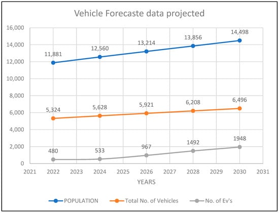 According to Equation (2), the population density of R.K Puram is approx. 5324 persons per square kilometer in 2022 and will increase by 3.03% yearly [,]. By assuming that by 2030 each individual will have one vehicle (such as 2w, 3w, 4w), we may deduce from Equation (2) that if we wish to put EVCS system in each square kilometer, i.e., in a 1 × 1 km area and according to prediction of government of Rajasthan’s electric department, 30 percent of the population will be driving electric cars by 2030, the total electric vehicles () in the region will be