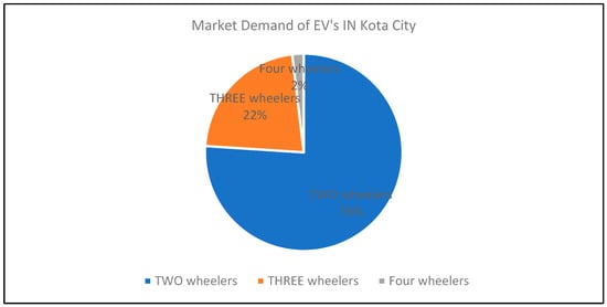 In the pie chart shown in Figure 6, as Kota is also known as a student area, the quantity of students is higher in this city and there are around three main colleges, namely Rajasthan technical university, Vardhman Mahaveer open university and Government medical college, as well as three schools located in this area, so many people here prefer two wheelers so that their children can easily go for studies. As seen in Figure 6, the percentage of people buying two wheelers are 76%, three wheelers are 22% and four wheelers is 2% [,]. Therefore, as the slow chargers are affordable in comparison to fast chargers, most of the people will use slow chargers in their home because, normally, at night, they can easily charge their vehicles at home. Therefore, there will be less rush for charging EVs with public chargers.