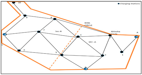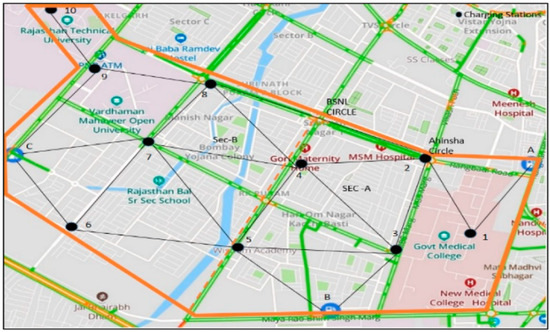 For sizing the charging station, it is significant to know the target to be accomplish and fulfill public demand, so that they will never run out of power in their vehicles. Here, in Figure 9, according to the survey, we located charging stations in a triangular manner as the distribution made in this shape will provide easy access to the maximum number of EV users from their homes in this area and will cover the maximum area in the minimum no. of EVSCs []. As for locating charging stations, we calculated the average values of charging potentials to be fulfilled, so that we can predict the maximum and minimum number of vehicles that can be charged in a single day. Thus, by analyzing these data, we can forecast the accurate number of charging ports to be placed in EVCS stations.